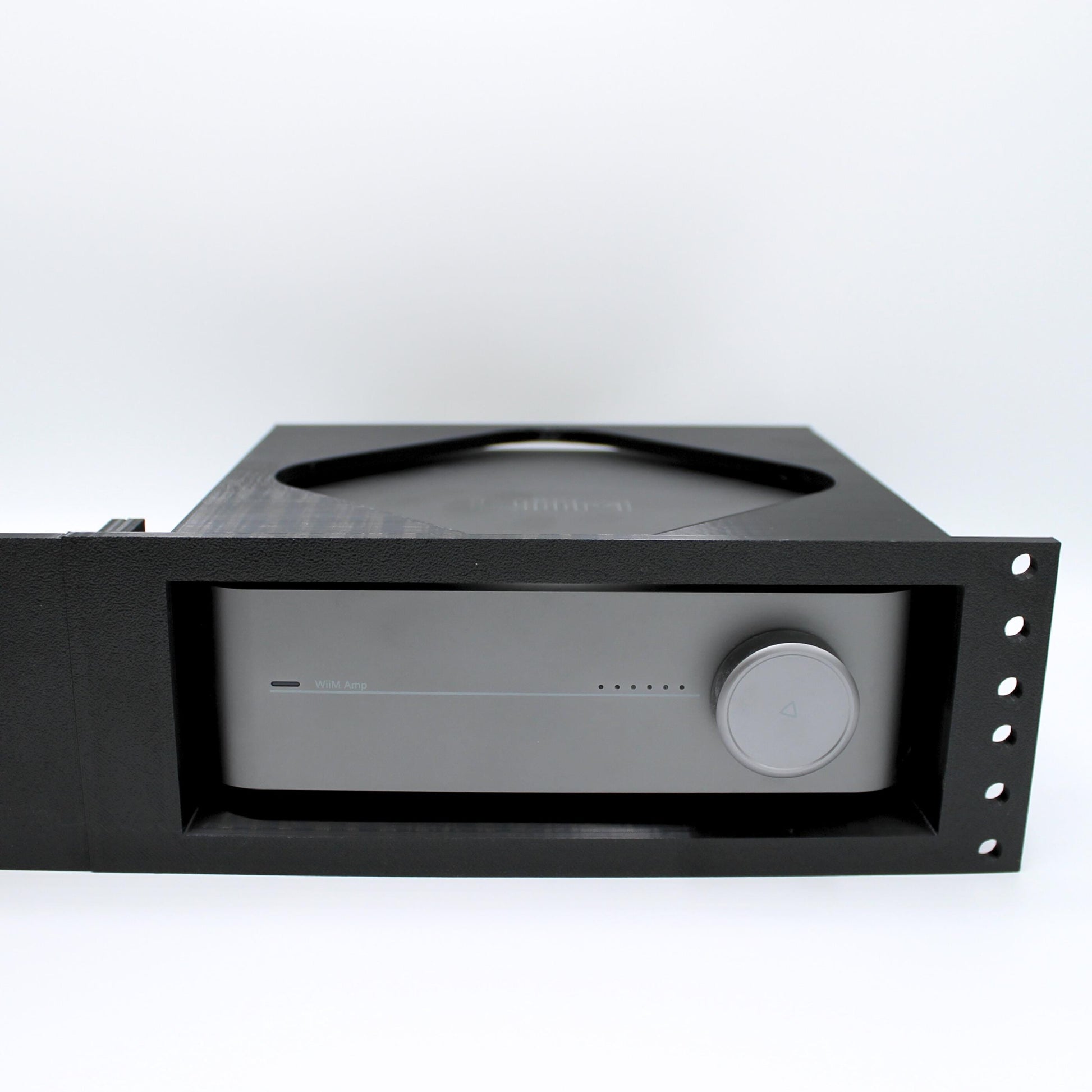 Rack Mount for the Wiim Amp & Amp Pro. Pieces come fully assembled. Rack screws not includes. 3D Printed with black PETG for better heat resistance and strength.